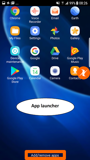 The configuration of the apps that are visible in the app launcher (as well as the definition of the popup apps) can be customized by touching the button “Add/remove apps”.