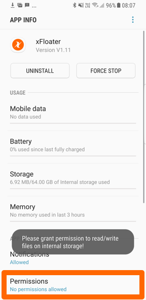 During installation, the application requires the authorization to read and write the storage (internal phone storage, folder “Documents”). This is necessary because certain settings are saved in files (in the RecentApps.dat file, the apps configured for the app launcher will be saved and in the “PopupApps.dat” file, the maximum of 11 popup apps will be saved).