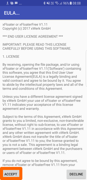 Subsequently, the End User License Agreement (EULA) has to be accepted before the application can be used. If the EULA is declined, the xFloater/xFloaterFree app can not be used.