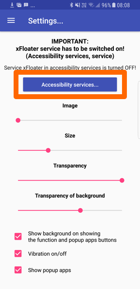 For the floating button to appear, the xFloater/xFloaterFree accessibility service must now be activated in the android system settings.