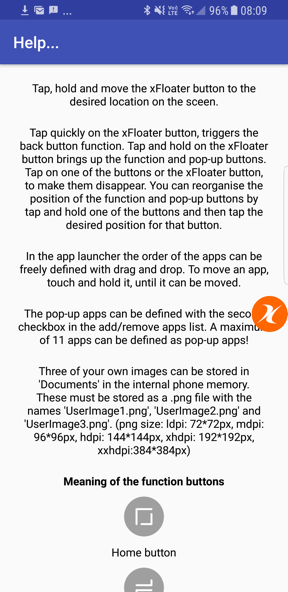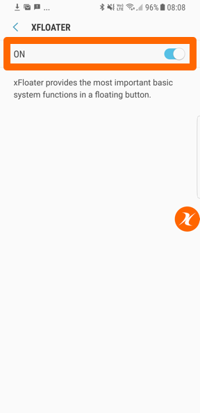xFloaterFree / xFloater is an app for Android™ that provides the most important functions back, home, recent apps, messages, short settings, camera light on/off and also an app launcher, in a floating button. The application is based on an Android system service, which must be activated in the accessibility settings.