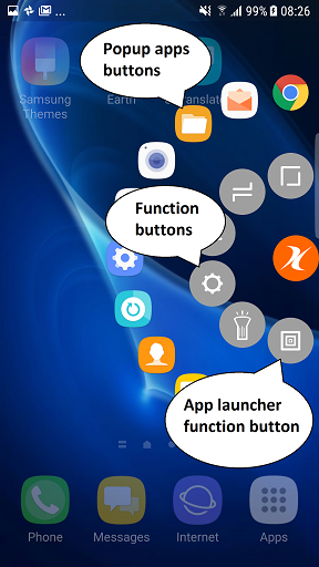Tap and hold on the xFloater button shows the function buttons (gray) and, if defined in the app launcher, the maximum of 11 popup apps buttons, which can be started directly by tapping them (does not apply to the xFloaterFree version ).