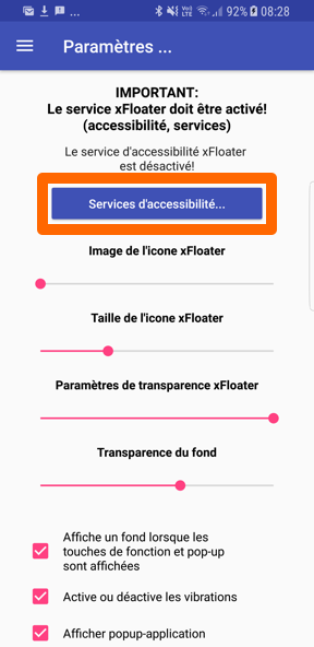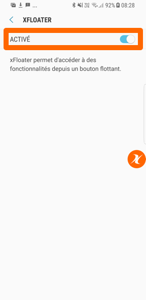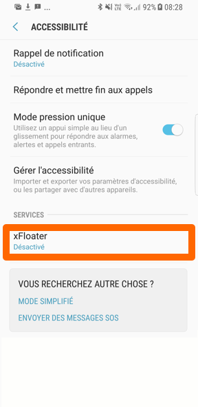 Alors que le bouton flottant apparaît à l’écran, le service xFloater/xFloaterFree doit être activé dans les paramètres Accessibilité du système.