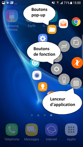 Une longue pression sur le bouton xFloater affiche les boutons de fonction (gris) et si sont définie dans le lanceur d’application, les maximum 11 pop-up boutons, qui peut être lancé directement (ne concerne pas la version xFloaterFree ).